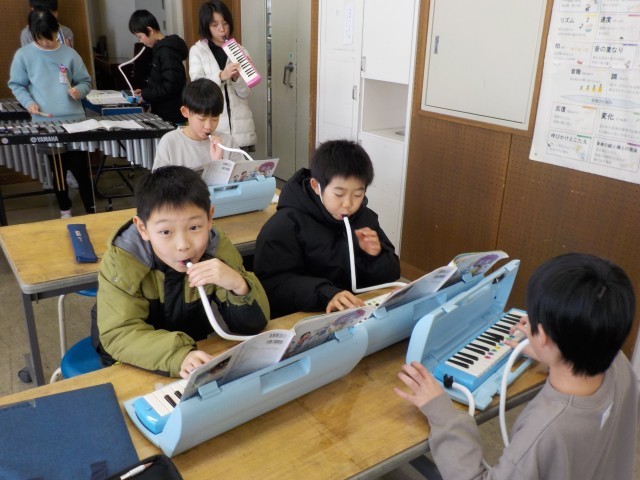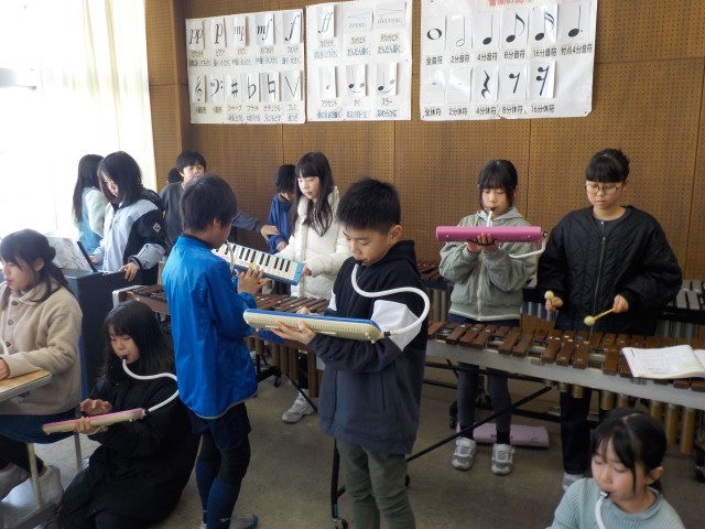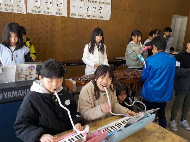 音楽の時間には「茶色の小びん」の合奏を楽しんでいます。木琴や鉄琴とのハーモニーを感じながら鍵盤ハーモニカを演奏しました。