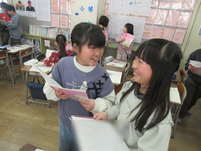 3年生の国語では、物語を作る学習をしています。1枚の絵から想像を膨らませて、オリジナルのストーリーを考えます。今日は絵から自由に想像したことを友達と交流しました。自分の考えた話を楽しそう話したり聞いたりする姿が微笑ましかったです。