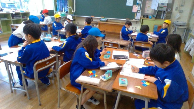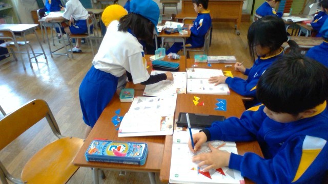 「かたちづくり」の学習では、色板を使い、いろいろな形を作っています。板を回したり入れ替えたりして、問題に取り組みました。