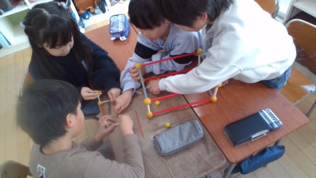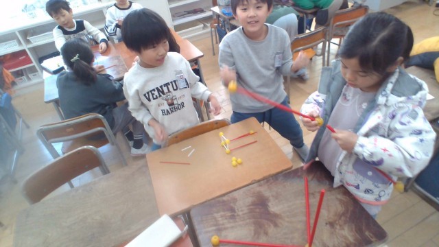 算数では、棒とボールを組み合わせて直方体や立方体を作りました。試行錯誤しながら形を完成させようと話し合う姿が見られました。