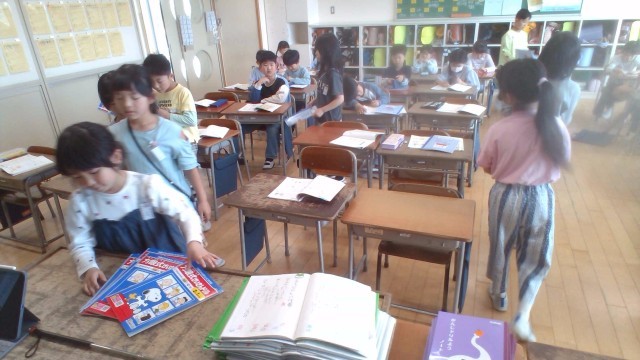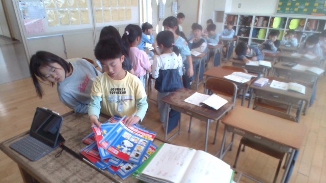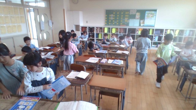 「配り物をお願いします。」の声をかけると自主的に配り物をしてくれる子供たちです。一列に並んで待つ姿も素晴らしいです。