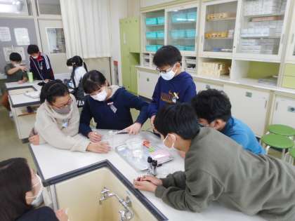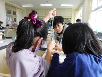 5年生は、理科で「物のとけ方」について学習を進めています。水の量や温度を変えながら、食塩やミョウバンを溶かし、実験を進めています。子供たちは、グループで協力しながら実験し、自分たちの予想を確かめていました。