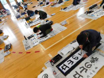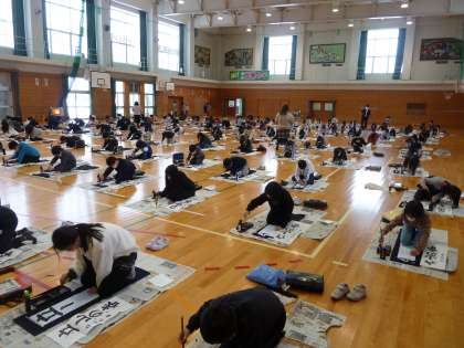 子供たちは、授業や冬休み中に練習をしてきた成果を出そうと、張り切っている様子でした。全員で書き始める際には厳かな空気に体育館が包まれました。