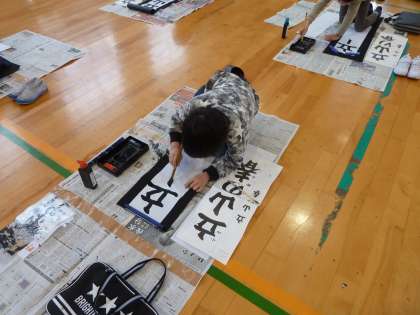 子供たちは、授業や冬休み中に練習をしてきた成果を出そうと、張り切っている様子でした。全員で書き始める際には厳かな空気に体育館が包まれました。
