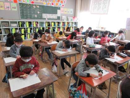 1年生の子供たちが、漢字チャレンジテストに取り組みました。これまでの練習の成果を出そうと、とめ、はね、はらいに気を付けて、丁寧に取り組む姿が見られました。