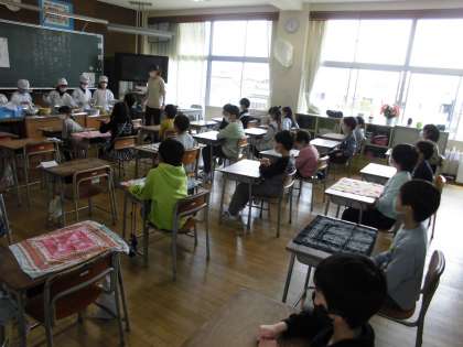 今日から給食が始まりました。静かに着席して準備をする子供たちの姿が見られました。