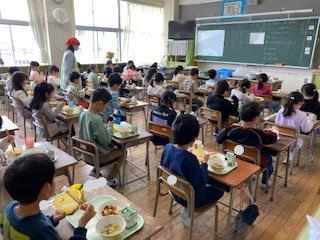 一年生の給食が始まりました。どの学級もすばやく準備を済ませ、静かに美味しくいただいていました。