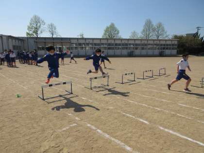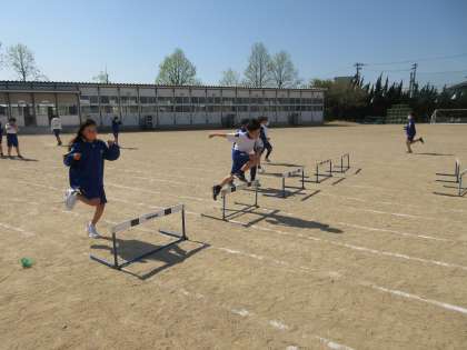 体育では、ハードル走に挑戦しています。4年生で学習んしたミニハードルの経験をいかし、「0・1・2・3」のリズムに合わせてハードルを跳んでいます。だんだん上手に跳べるようになってきました。