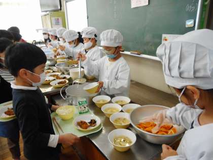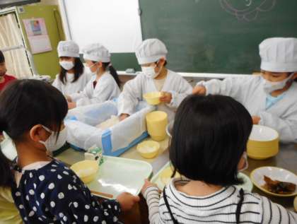 給食の準備を一生懸命しています。当番の子供たちは、おかずやごはんをこぼさないよう気を付けて盛り付けをしていました。