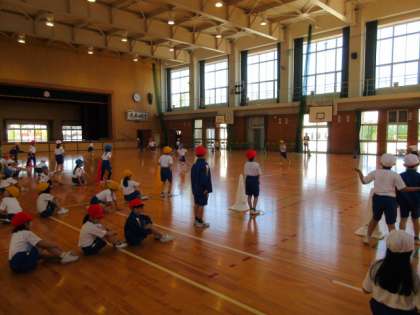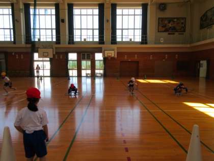 体育の時間に折り返しリレーをしました。カラーコーンを折り返して走ります。走るだけでなく、リレーのコースの中にミニハードルやフラフープ等を置いて、いろいろな動きを楽しんでいます。