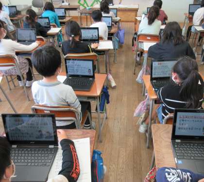安心で安全なパソコンの利用ができるように、パソコンの使い方を学習しています。「パソコンを使うときの10の約束」の動画を視聴したり、カメラ機能を使ったり、アンケートに答えたりしました。これからさらにできることを増やし、授業等に活用していきます。