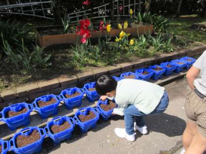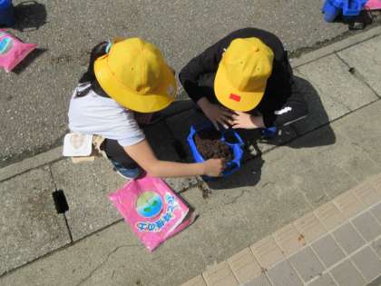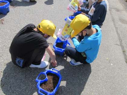 生活科の学習で野菜を育てます。今日は、1年生の時に朝顔を育てていた鉢に土を入れました。この後、この鉢にミニトマトの苗を植える予定です。