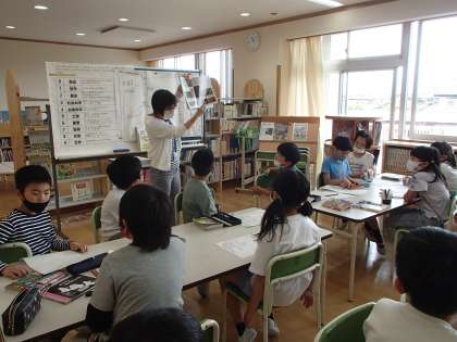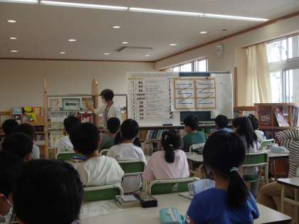 国語科の学習で、子供たちは「図書館たんていだん」になって、学校の図書館調べを行いました。司書の先生に、どこに、どんな内容の本があるのか教えていただき、学校図書館の地図を作りました。