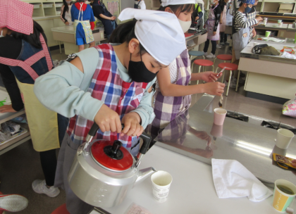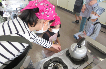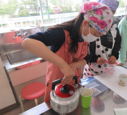 家庭科の学習では、ガスこんろを使ってお湯をわかしました。初めての調理実習でしたが、安全に気を付けてお茶をいれることができました。