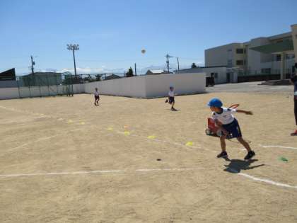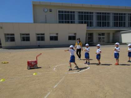 体育の時間にソフトボール投げをしました。肩、肘、足、全身を使って投げるフォームを練習して、ソフトボール投げに挑みました。よい記録を出そうと頑張りました。