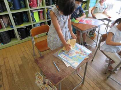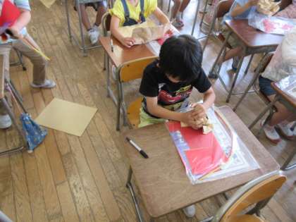 図工の時間に、クラフト紙をくしゃくしゃに丸めたり、握ったりして作品作りをしました。紙はたくさんしわをつけると柔らかくなることを、体験を通して実感していました。これからこのクラフト紙に新聞紙をつめて、生き物を作っていきます。どんな作品ができるのか、今から楽しみです。