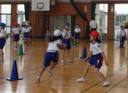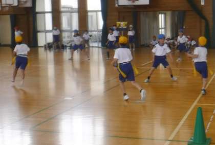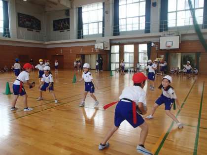 体育科「タグラグビー」の学習では、「お宝ゲットゲーム」の次のステップ「ボール運びゲーム」を行っています。このゲームでは、パスをする「タグラグビー」に向けて、ボールを両手で持って走ります。感染症対策のため距離をとっての作戦会議をした後、ゲームをしました。子供たちはそれぞれのチームで考えた作戦を実行しよう、得点を取ろうと、汗だくになって運動していました。