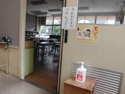 3 教室に入る前にアルコール消毒をします。アルコールが合わない人は、手を石鹸でしっかり洗いましょう。