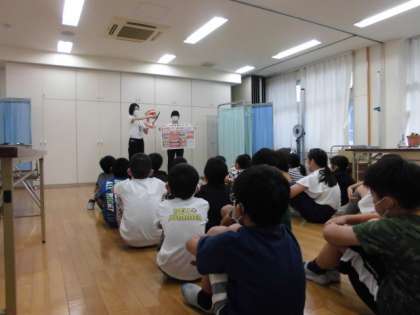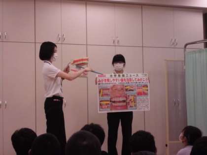 視力測定の前に、歯の磨き方について指導をしました。歯磨きは、コロナウイルス感染症予防にも繋がります。正しい磨き方で、健康な体づくりを心がけましょう。
