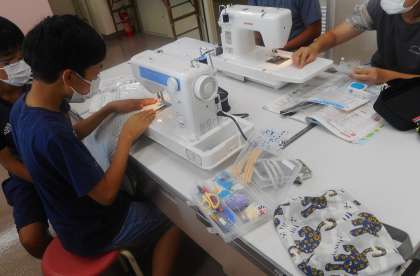 家庭科の学習では、ミシンを使ってトートバックを作っています。上糸をかけたり下糸を引き出したりをスムーズに行い、楽しく学習に取り組んでいます。