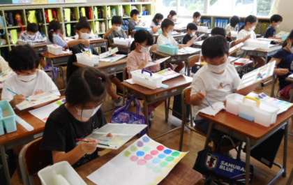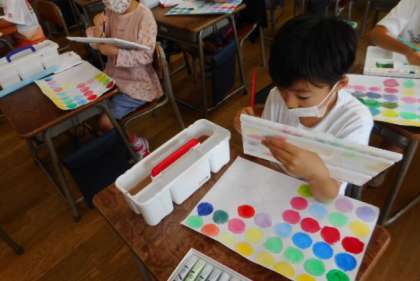 図画工作科の時間の様子です。絵の具を混ぜて、鮮やかな色をたくさんつくりました。