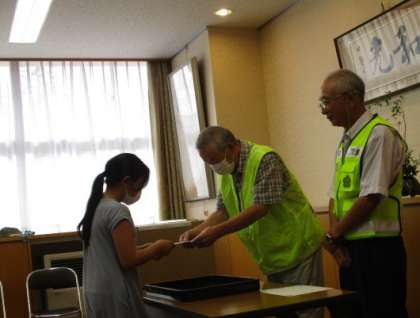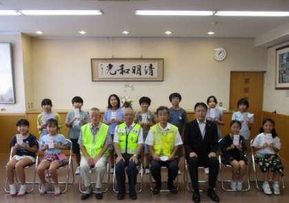 交通安全標語表彰式がありました。富山南交通安全協会 堀川南地域支部が、4年生が考えた標語の中から審査され、その結果、最優秀賞1点、優秀賞9点が選ばれました。また、富山南交通安全協会から、全校児童に反射板をいただきました。