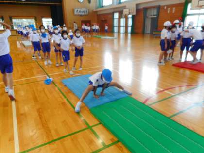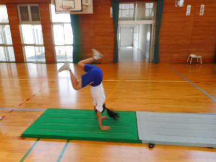 写真は「カエルの逆立ち」「倒立ブリッジ」「開脚前転」に取り組んでいる様子です。