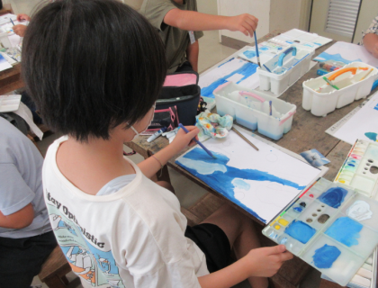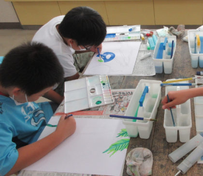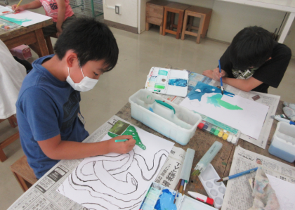 下描きをした絵に水彩で色を塗りました。グラデーションにしたり水の量を調整したりするなど、塗り方を工夫をしていました。