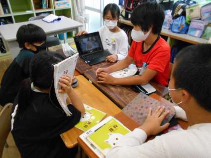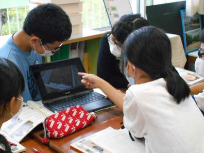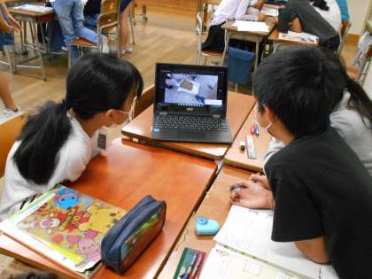 グループごとに理科の実験を行いました。タブレットで撮った動画を見返して、結果から分かることを話し合っています。