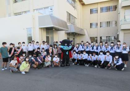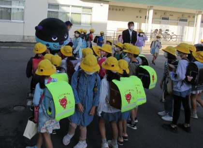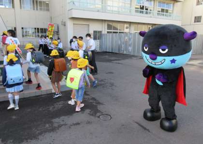 そして14日(木)にはさらに、国立立山青少年自然の家から「早寝早起き朝ごはん」の挨拶キャラバン隊「よふかしおに」が来てくれました。子供たちが元気にあいさつをすると「よふかしおに」も元気になっていきました。登校して来た全校の子供たちはキャラクターに大喜びで、「早寝早起き朝ご飯」の大切さを伝えてもらいました。