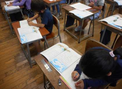 国語科では「くじらぐも」を学習しています。それぞれ、はじめて読んだ感想を書きとどめているところです。