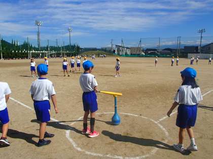 体育科の学習では、ベースボール型ゲーム「Tベース」の学習をしました。打ち方や、安全面についての指導後、チームごとに分かれて、ボールを打ったり、守ったりする練習を行いました。初めてバットを握る子もいて、友達に教えてもらいながら取り組む姿が見られました。