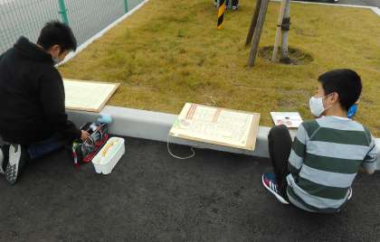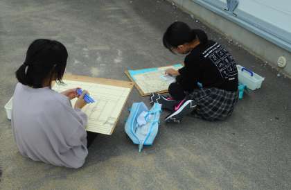 図画工作科の学習で、校舎の絵を描いています。新校舎や体育館などが入るように自分のお気に入りの角度を見つけて丁寧に取り組んでいます。