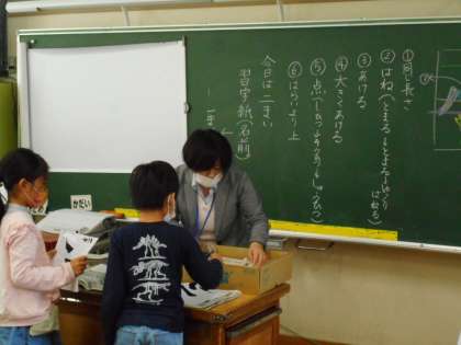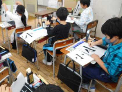 書写の学習では、筆使いに気を付けて「小」という字を書きました。はねるところでは、一度筆を止め、だんだん力を抜いていくことを意識しました。筆の動きをイメージしながら書いた1枚を清書として提出しました。