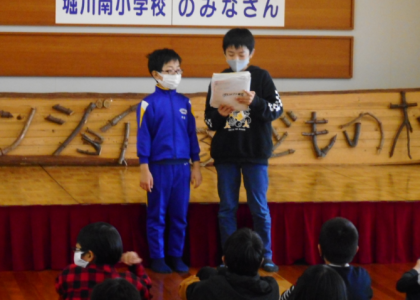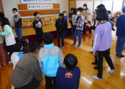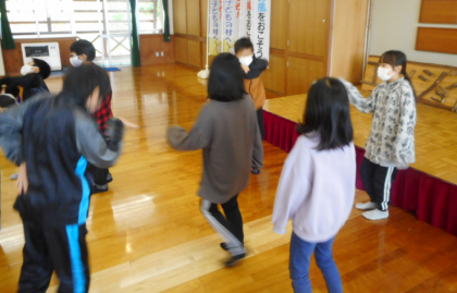 学年集会では、活動係が考えたゲームを行いました。1・2組は、伝言デーム・たけのこニョッキ・ジェスチャーゲーム・震源地ゲームをしました。
