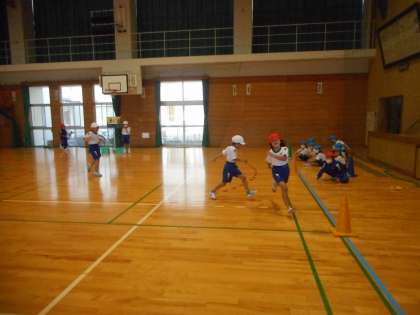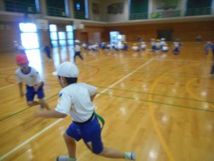 体育科の学習で宝取り鬼をしています。鬼にタグを取られないように、動き方を考えて取り組んでいます。楽しく力を合わせながらたくさん宝を取っていました。