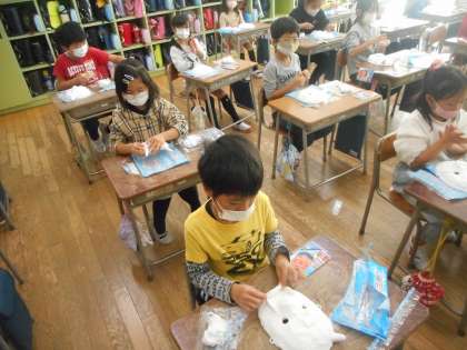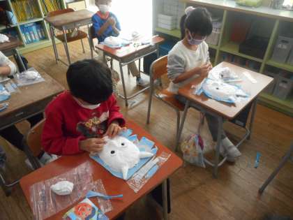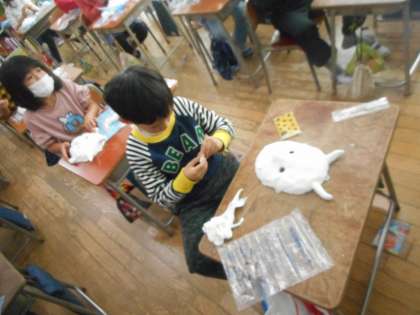 図工の時間に紙粘土を使って、鬼のお面を作っています。自分なりにイメージを膨らませながらおもしろい鬼やかわいい鬼等、いろいろな鬼を作りました。