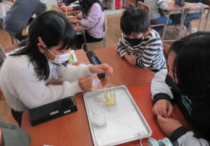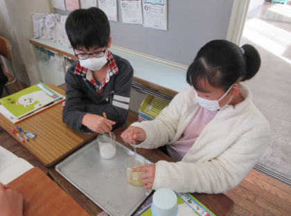コーヒーシュガーと片栗粉を水に入れて混ぜる実験をしました。混ぜた後の様子を観察することができました。