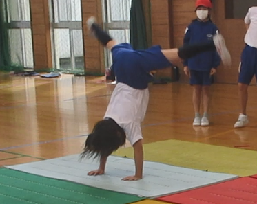 色団ごとにマットの発表会をしました。音楽にのせて、息の合った演技を披露することができました。