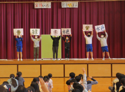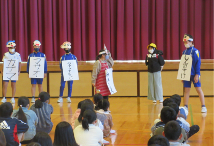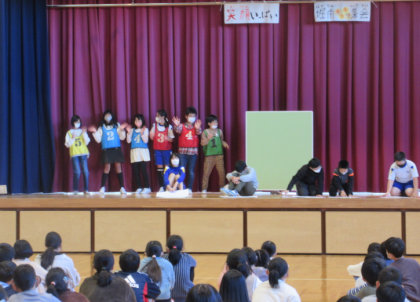 集荷委員会が企画した笑顔いっぱい堀南キラキラ集会に参加しました。集会委員会の子供たちは集会に向けて練習に取り組んできました。集会に参加した子供たちは、ゲームやクイズを楽しんでいました。