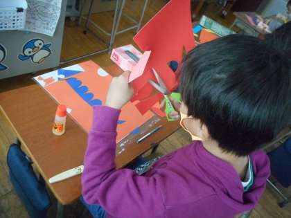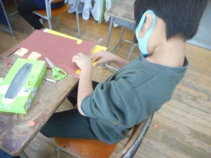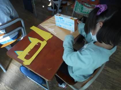 生活科の学習では、おもちゃ作りをしています。作ったおもちゃで遊ぶことを楽しみにしながら、意欲的に学習に取り組んでいます。