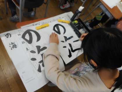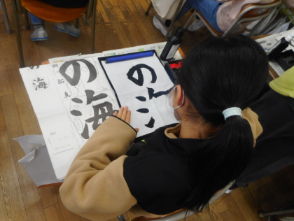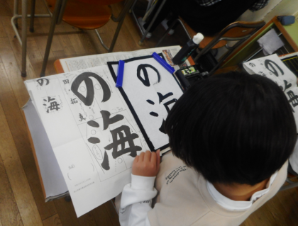 1月の書き初め大会に向けて、書き初めの練習が始まりました。5年生は「初日の海」と書きます。
