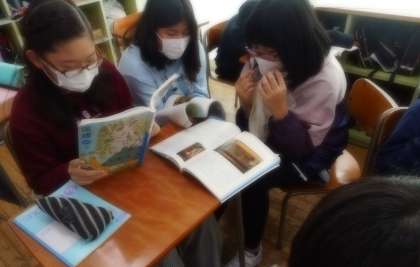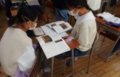 国語科で狂言「柿山伏」を学習しています。古典芸能の文章を友達と一緒に親しみをもって音読しています。