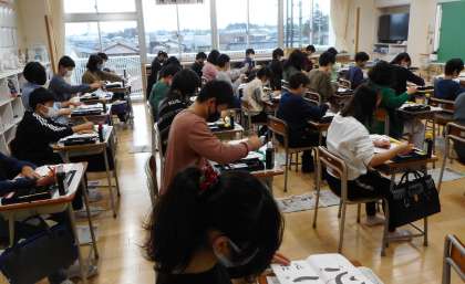 始業式の後に書き初め大会を行いました。今までの練習の成果を発揮しようと一筆一筆ていねいに書いていました。