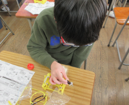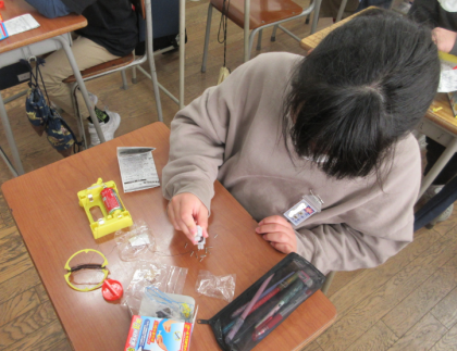 電磁石をつくり、方位磁針やくぎを使って電磁石の性質を調べました。普通の磁石との相違点に気付くことができました。