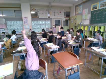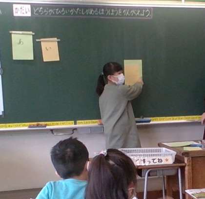 二枚の紙の広さを自分で比べながら、どちらが広いかを確かめる方法を考えていきました。「角と角をあわせるといいよ」「はみ出さないように重ねないと!」等、みんなで話し合いながら学習を進めています。