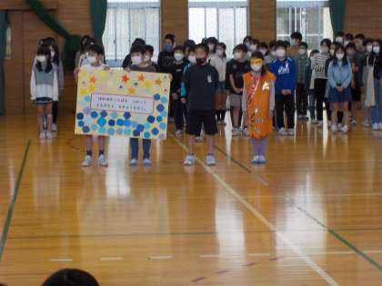 1年生の入学をお祝いして、5年生全員で折った折り紙を貼ったメッセージをプレゼントしました。練習の成果を発揮し、心を込めて言葉を伝えました。