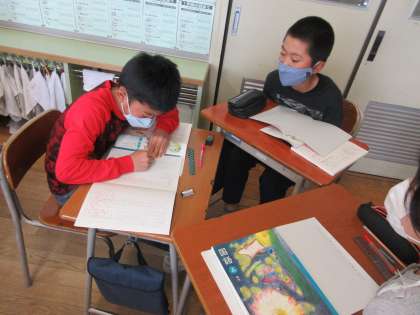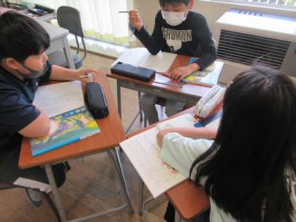 国語科「きいて、きいて、きいてみよう」の学習では、話し手、きき手、記録者の役割を交代しながらきく活動をしています。