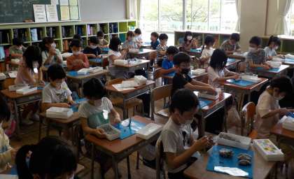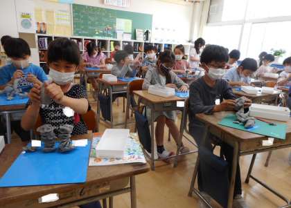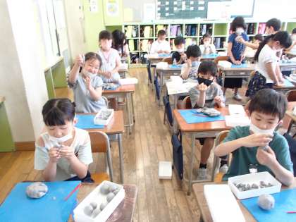 ねんどを握ったり、引っ張ったりして、できた形を食べ物や建物に見立てました。