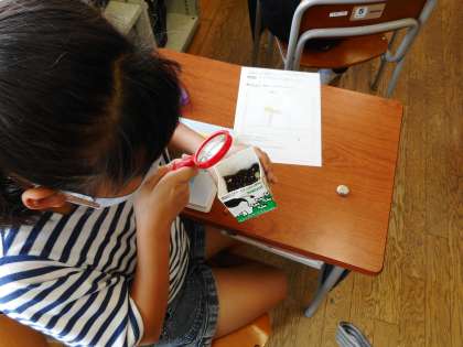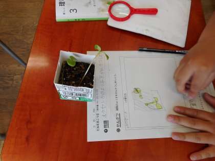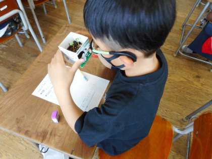 ホウセンカに芽が出てきました。虫眼鏡で子葉をよく観察しています。